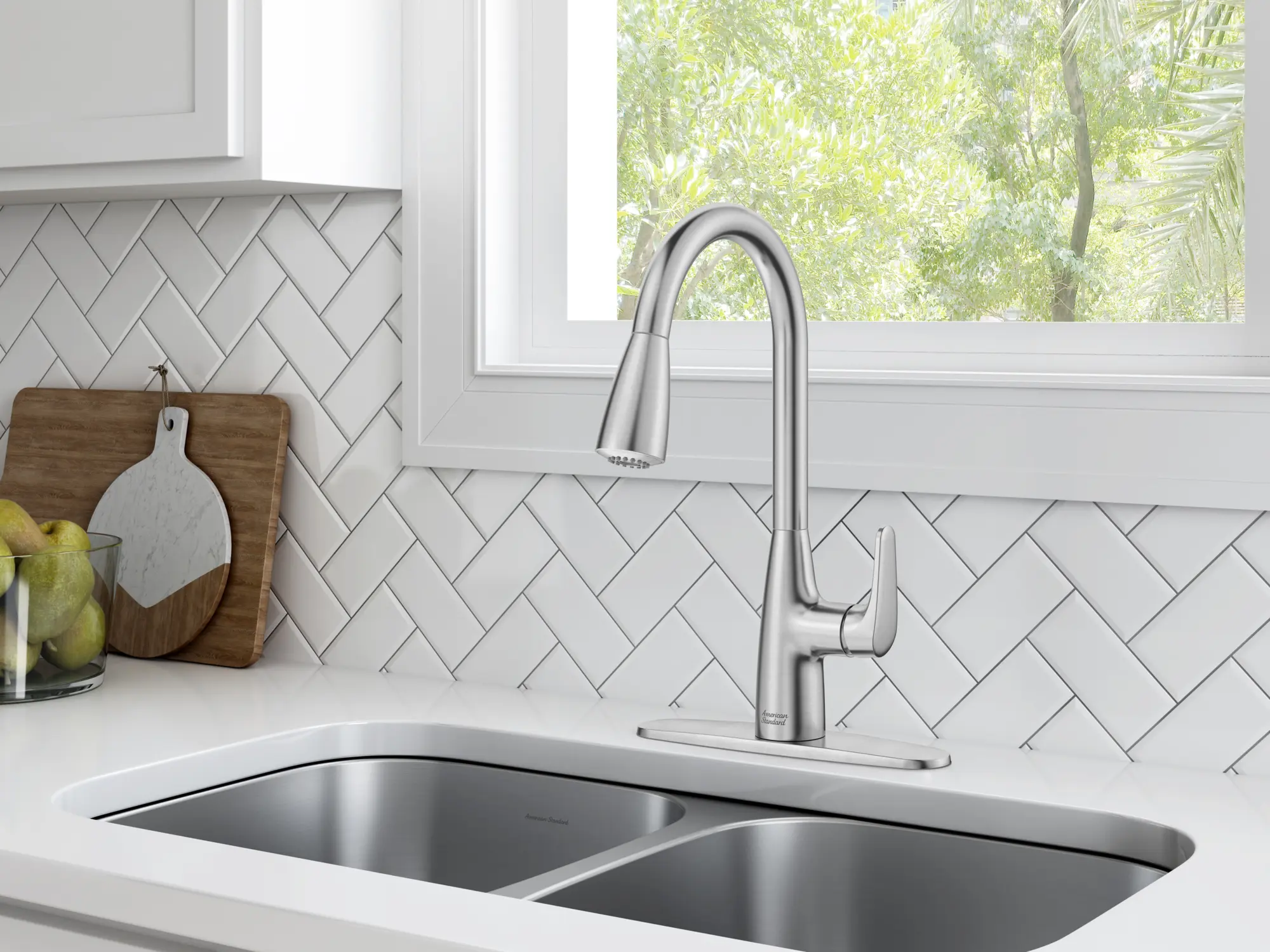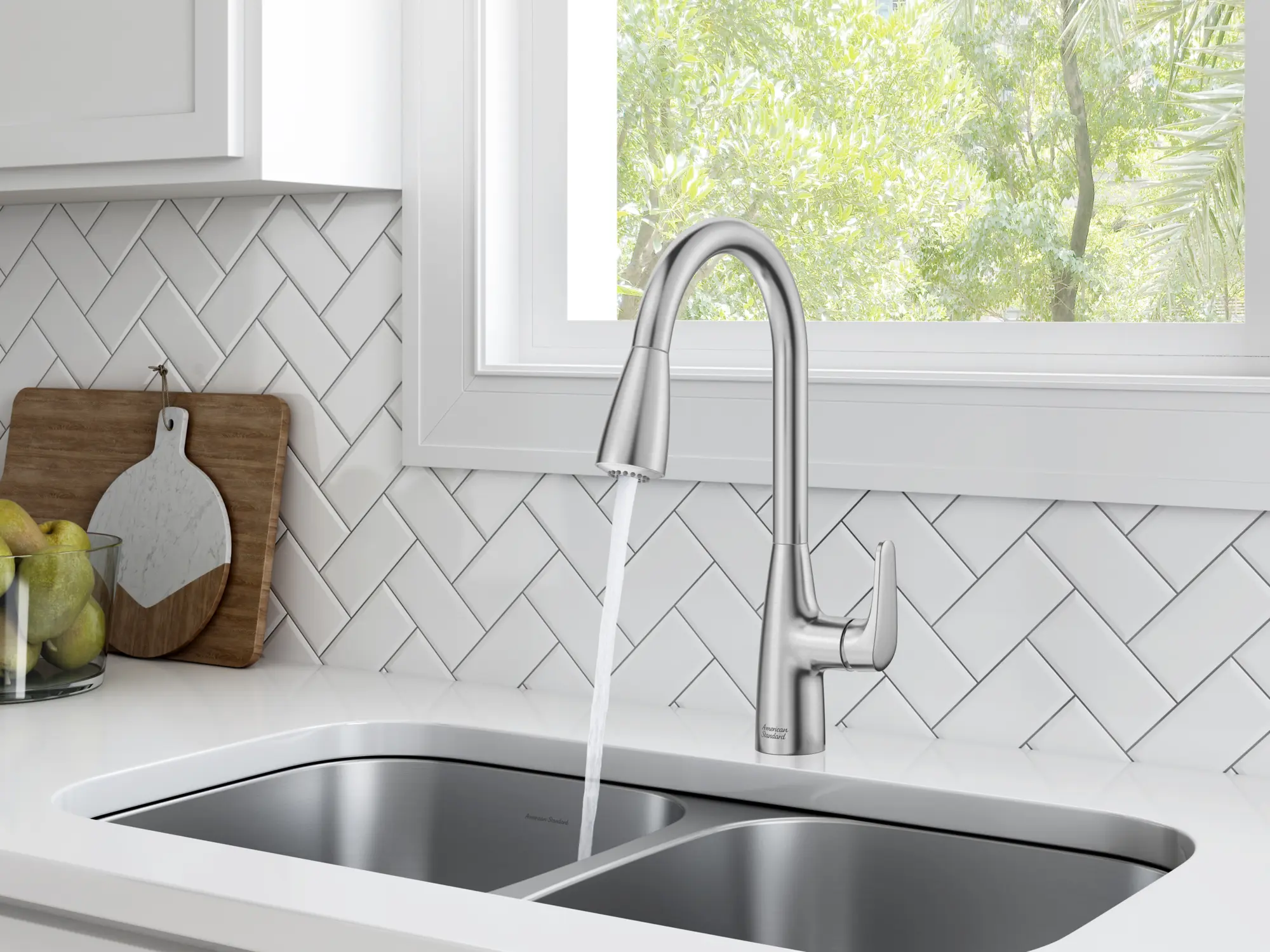 The Colony PRO Single-Handle Dual Spray Pull-Down Kitchen Faucet from American Standard is a sleek, single-hole faucet designed to update every kitchen with added efficiency and lasting beauty. This high-arc faucet features a swivel spout and dual function spray head with stream for filling pots, spray for rinsing vegetables, and pause to stop the water flow without turning off the faucet. Built for durability, this multifunction kitchen faucet has metal touchpoints and promises drip-free performance for life.