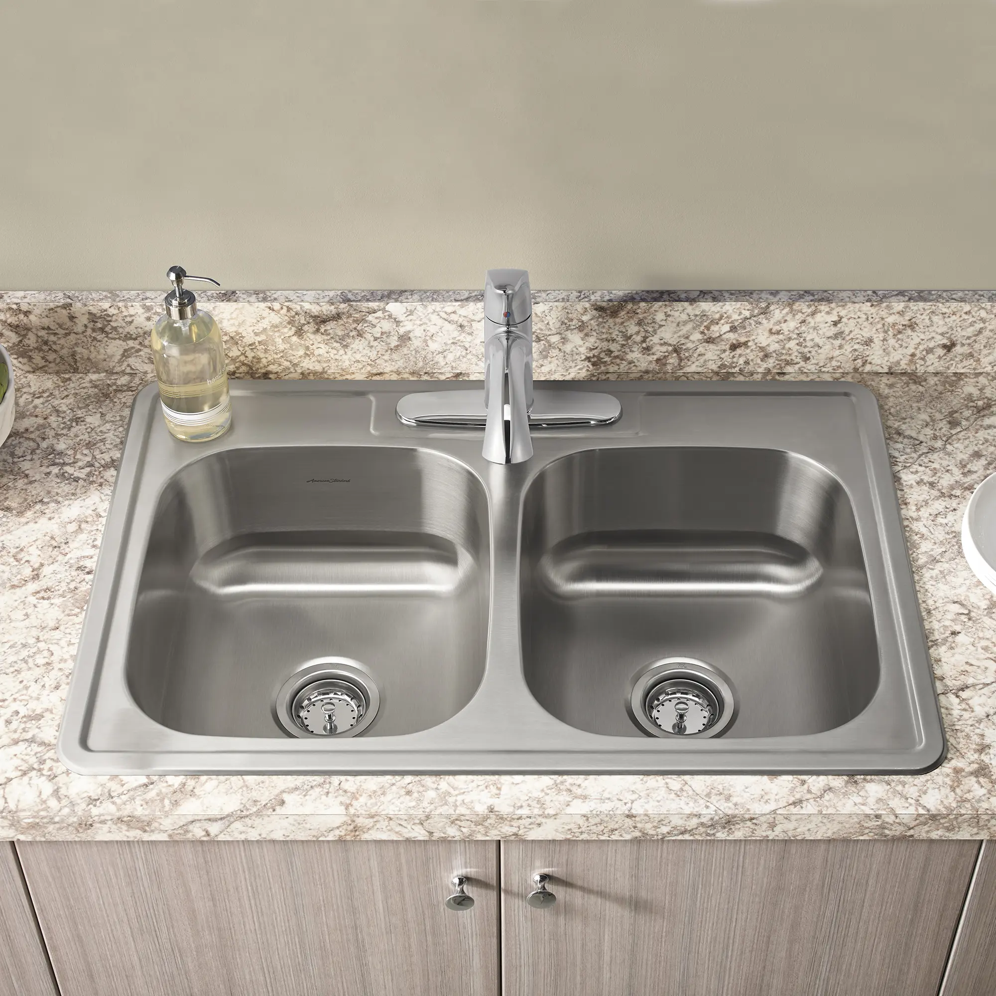 Colony sinks are perfect for a quick kitchen makeover. Featuring traditional styling and convenient top mount installation, these sinks can be dropped in and ready to go quickly and efficiently. This 33" double bowl sink is made from durable 20-gauge stainless steel and is equipped with bottom sound pads and full spray insulation, ideal for scratch, sound, heat and condesation protection.