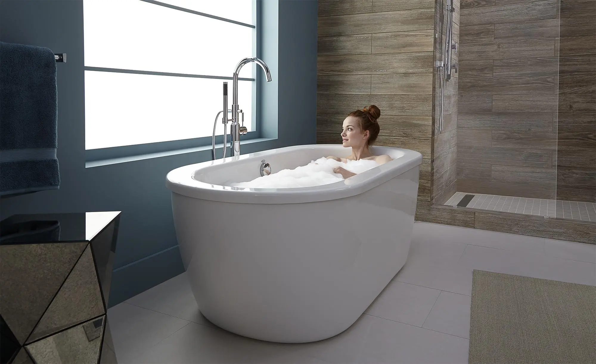 A tradition of practicality and function. This freestanding soaking bathtub with an extra deep bathing well is the newest addition to our Cadet® Suite. It features sleek, contemporary styling that goes well with classic and modern décor. Comes complete with a tub filler with hand spray and drain. Freestanding installation.