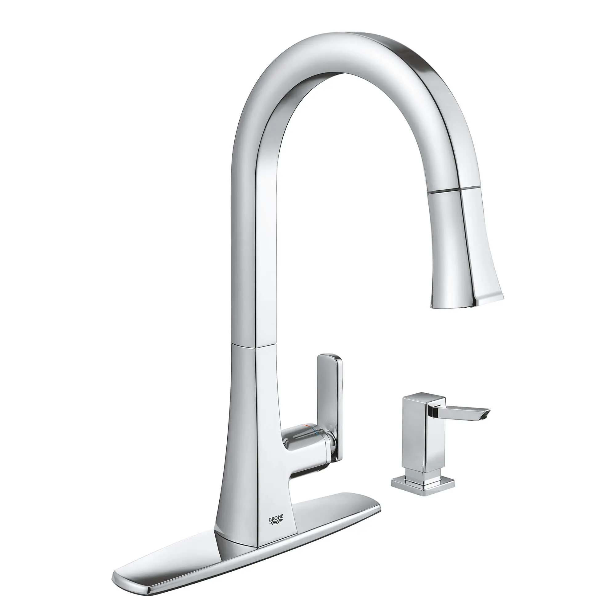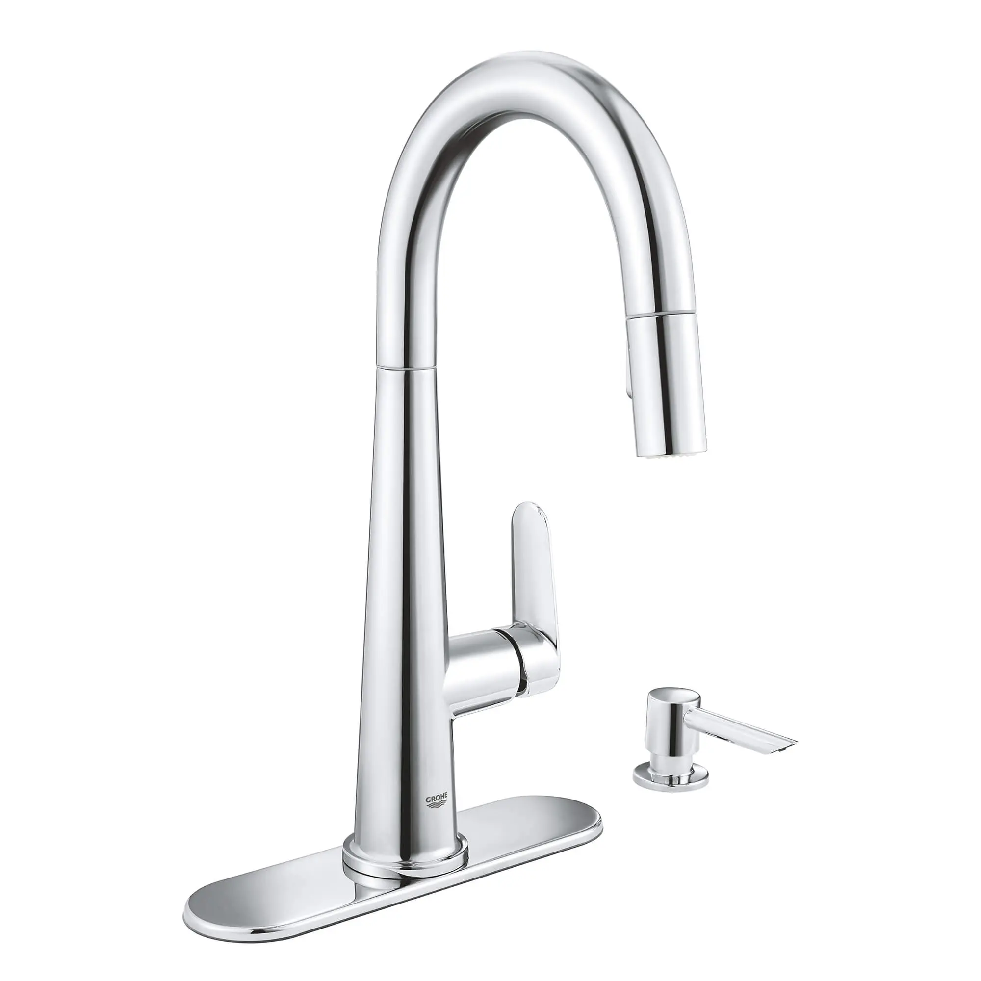 Includes GROHE SilkMove cartridge, which delivers smooth, effortless control of the water flow and temperature and a lifetime of maintenance-free operation GROHE StarLight technology produces a flawless, long-lasting surface that resists dirt and scratches, requires little maintenance and will retain its beauty through a lifetime of use Pull-out spray head allows for easy switching between an aerated stream for regular washing and a vigorous spray function for heavy-duty cleaning Spray head has GROHE SpeedClean nozzles, which require only a quick wipe of a hand or cloth to remove limescale and keep the faucet functioning optimally Swivel spout rotates 360 degrees for maximum coverage and accessibility EasyDock guarantees easy retraction and smooth docking for your pull-out spray head, every time. Forward rotating lever allows ample range of motion without backsplash interference Features GROHE Comfort Height for easy filling of large pots Includes optional deck plate and soap dispenser for a 1, 2, 3 or 4-hole installation Nominal Dimensions: 10-15/16 in x 10 in x 15-7/16 in (278 mm x 254 mm x 392 mm)