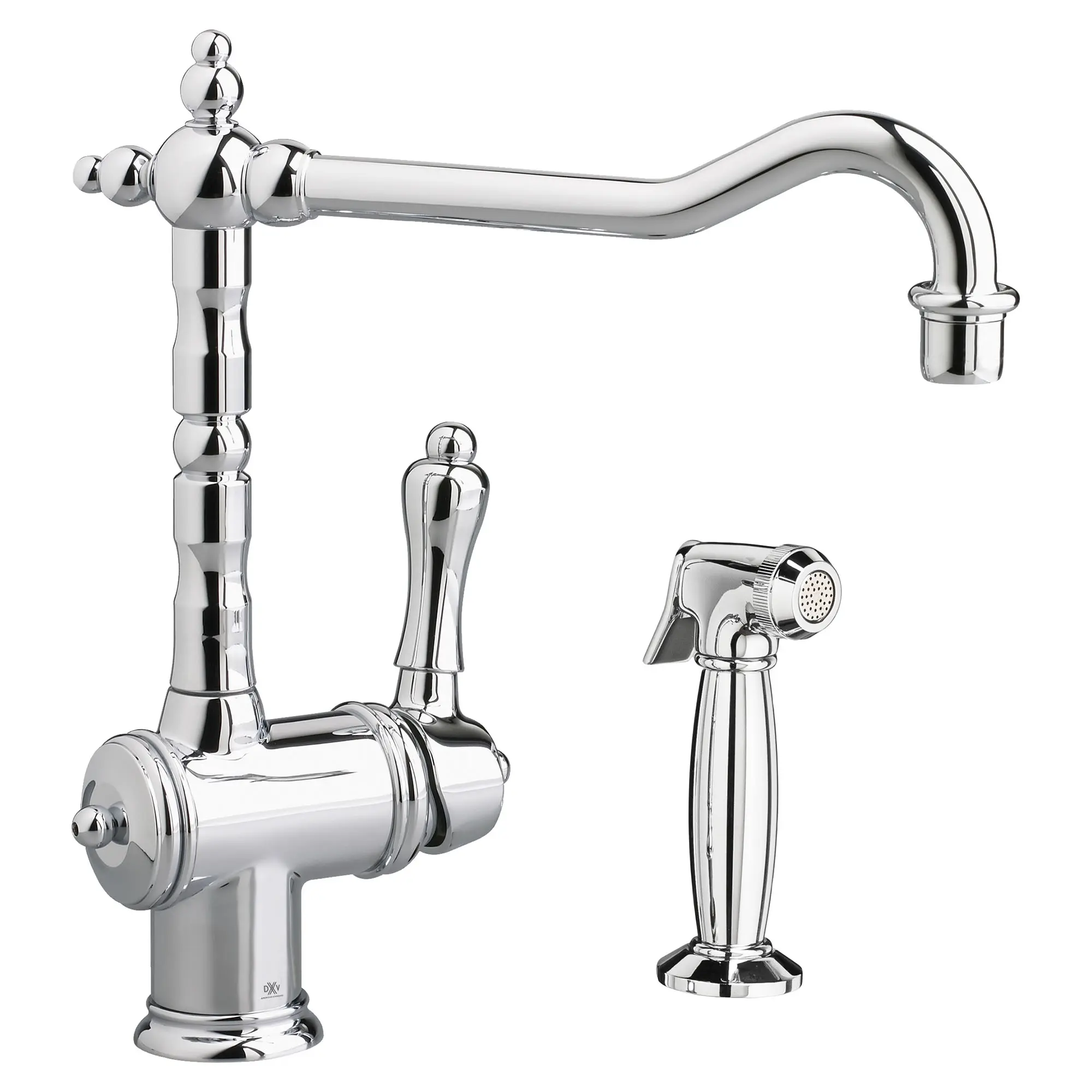 1/4-turn washerless ceramic disc valve cartridges Durable cast brass waterway with 1/2" (13 mm) male inlet shanks Metal deck plate and metal lever handles Brass gooseneck swivel spout Spout height: 12" (305 mm) Spout clearance: 7-1/2" (191 mm) Color-matched side spray 2.2 gpm/8.3 L/min maximum flow Nominal Dimensions: 9.4 in x 15.7 in x 11.8 in (239 mm x 399 mm x 300 mm)