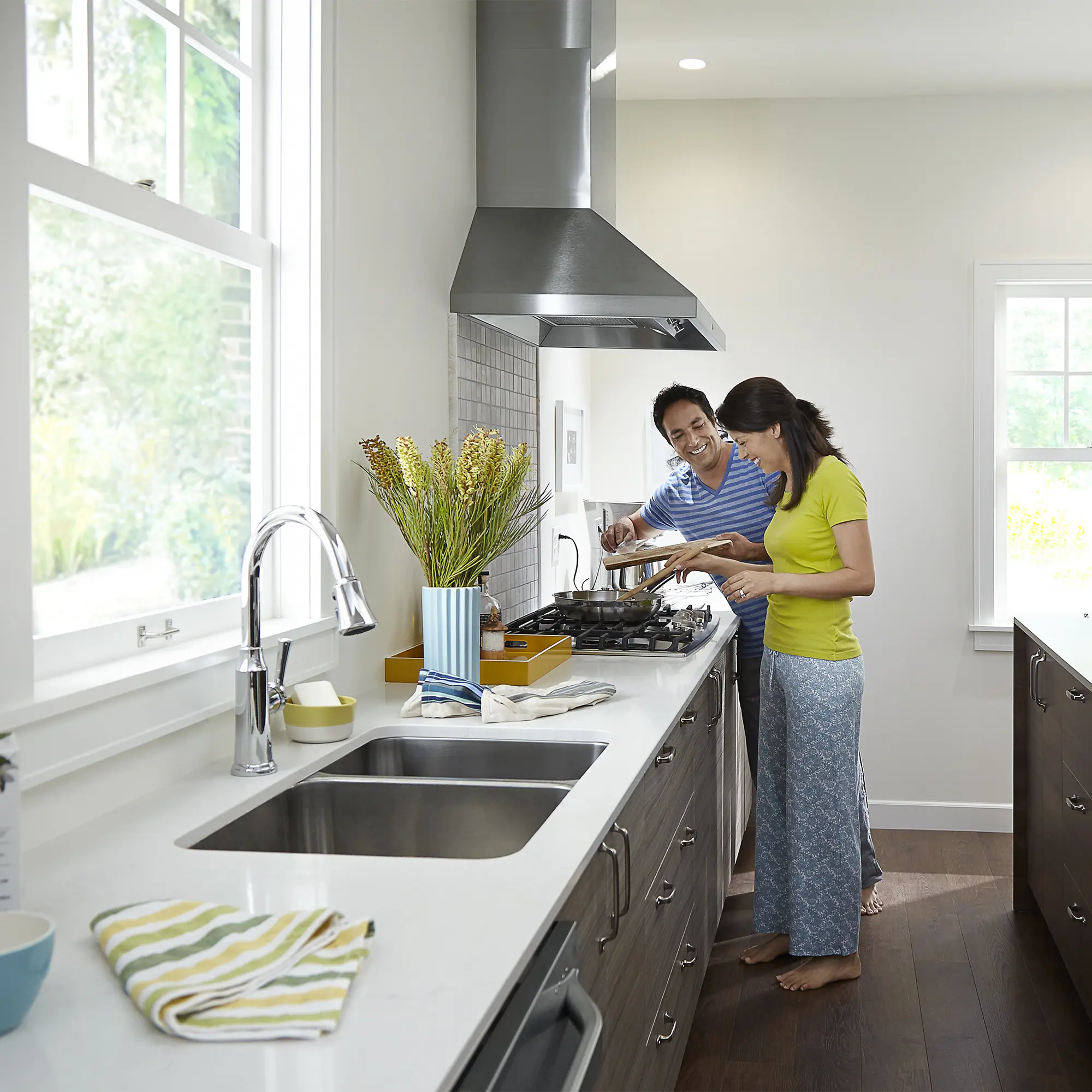 SelectFlo Spray Head: 4 function spray with pause offers STREAM, SPRAY, MIST and JET sprays to perform various kitchen tasks. See the SelectFlo Faucets in action Re-Trax Pull-Down System: Allows the spray head to retract completely and features a more flexible spray hose for easy movement while performing kitchen tasks Ceramic Disc Valve Cartridge: Assures smooth, precise valve control and a lifetime of drip-free, maintenance-free performance Memory Position Valving: Allows user to turn valve on and off at preferred temperature setting without readjusting handle position each time Lead Free: Faucet contains 0.25% total lead content by weighted average Integral Check Valves: Prevents back flow Integral Check Valves: Prevents back flow Nominal Dimensions: 8-11/16 in x 10-1/16 in x 16-13/16 in (221 mm x 256 mm x 427 mm)