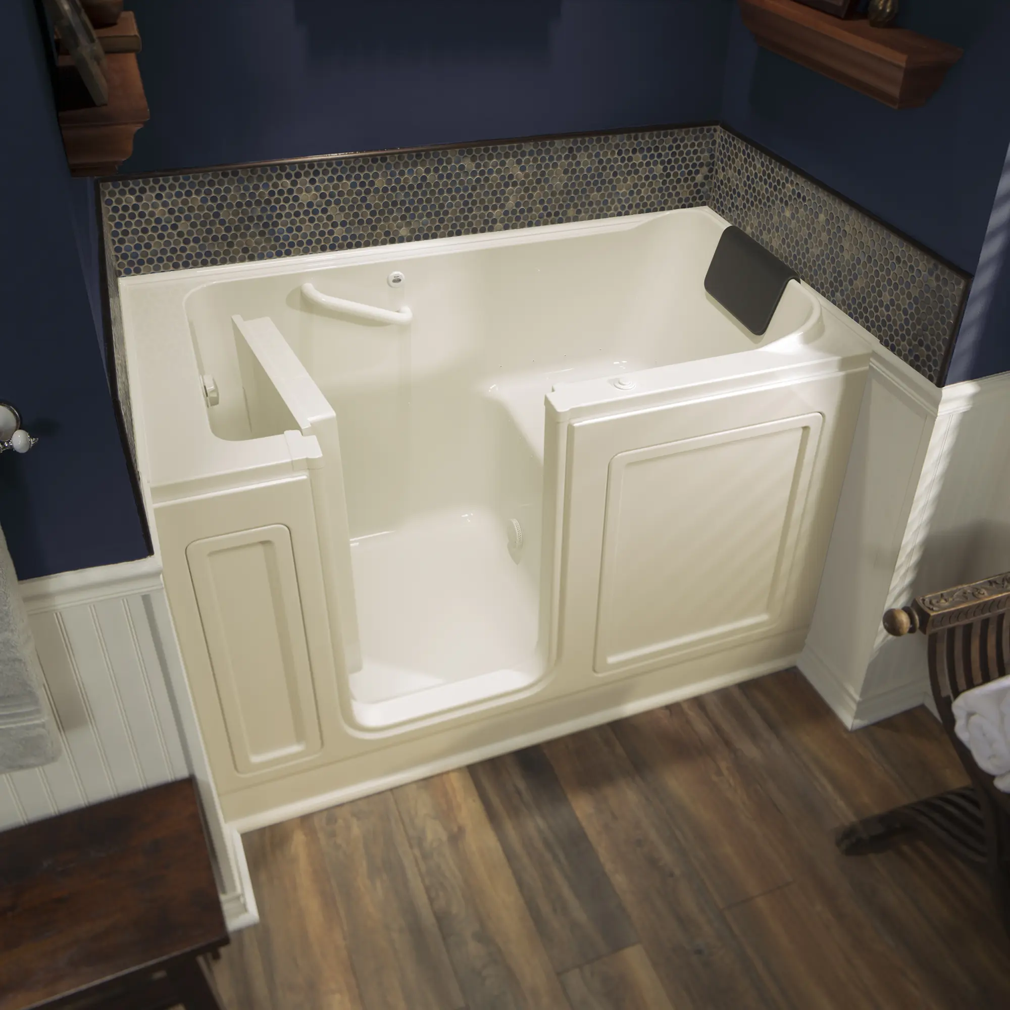 - A built-in safety grab bar and textured bath floor increases your level of bathing independence and delivers peace of mind by giving you fewer opportunities to slip or lose your balance