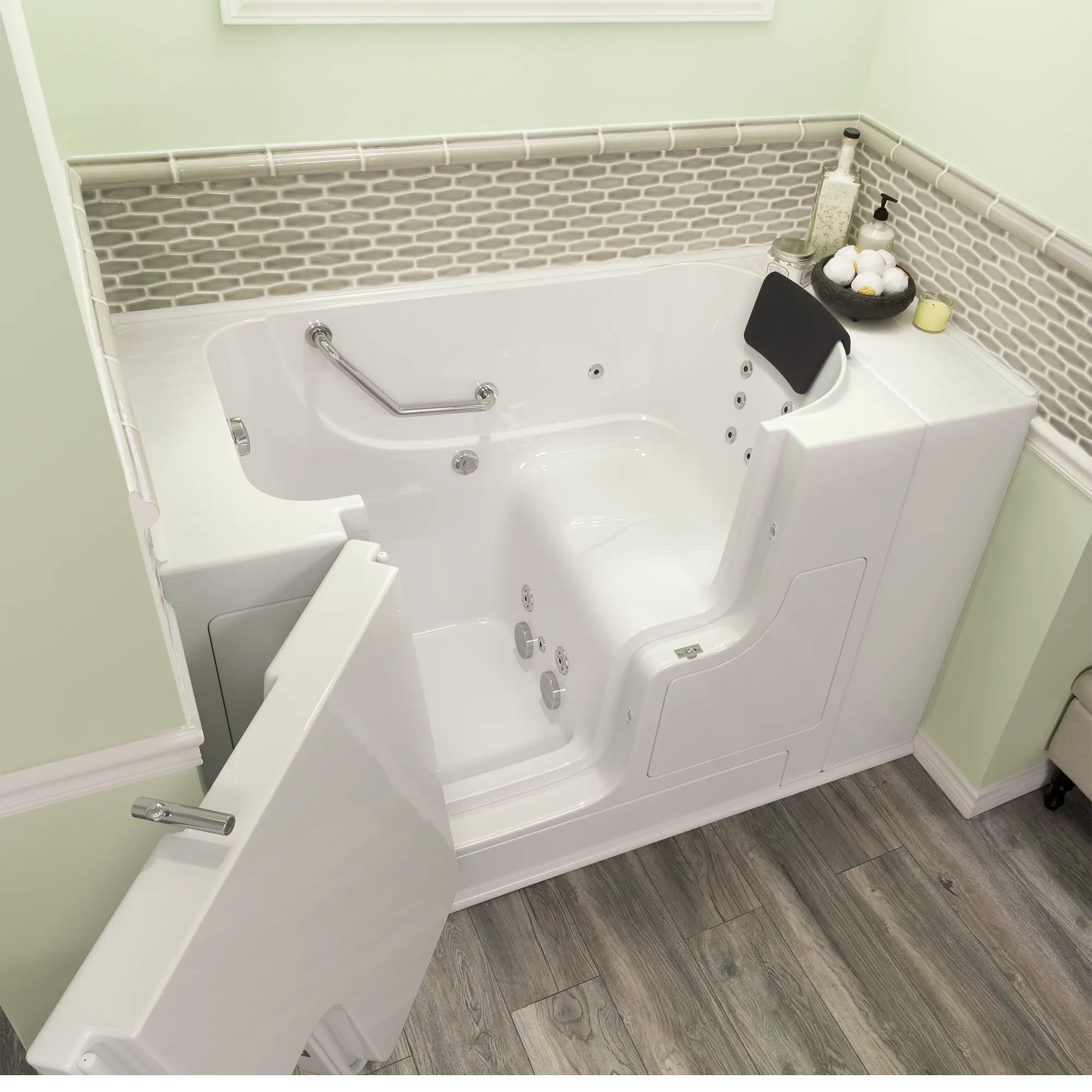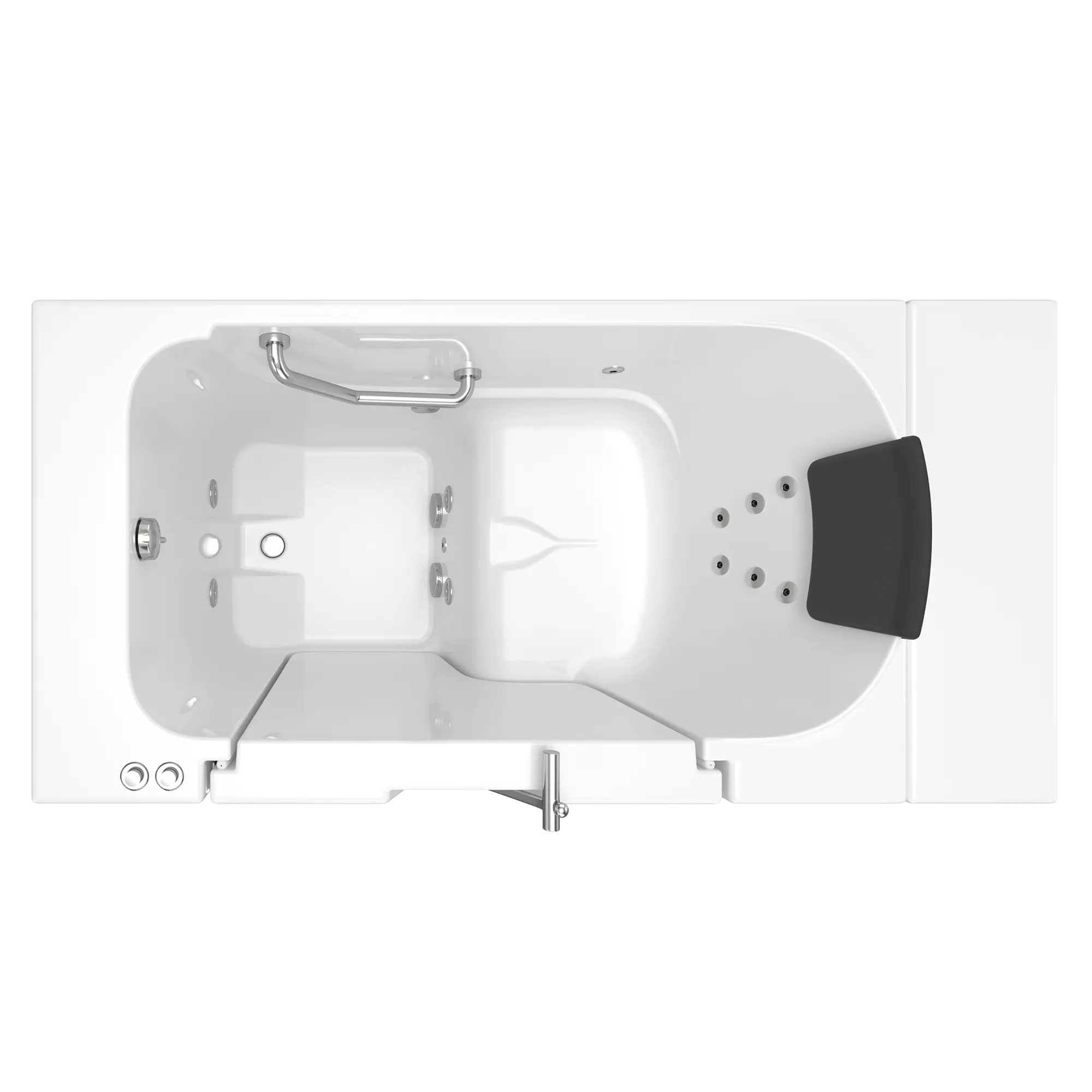 - A built-in safety grab bar and textured bath floor increases your level of bathing independence and delivers peace of mind by giving you fewer opportunities to slip or lose your balance