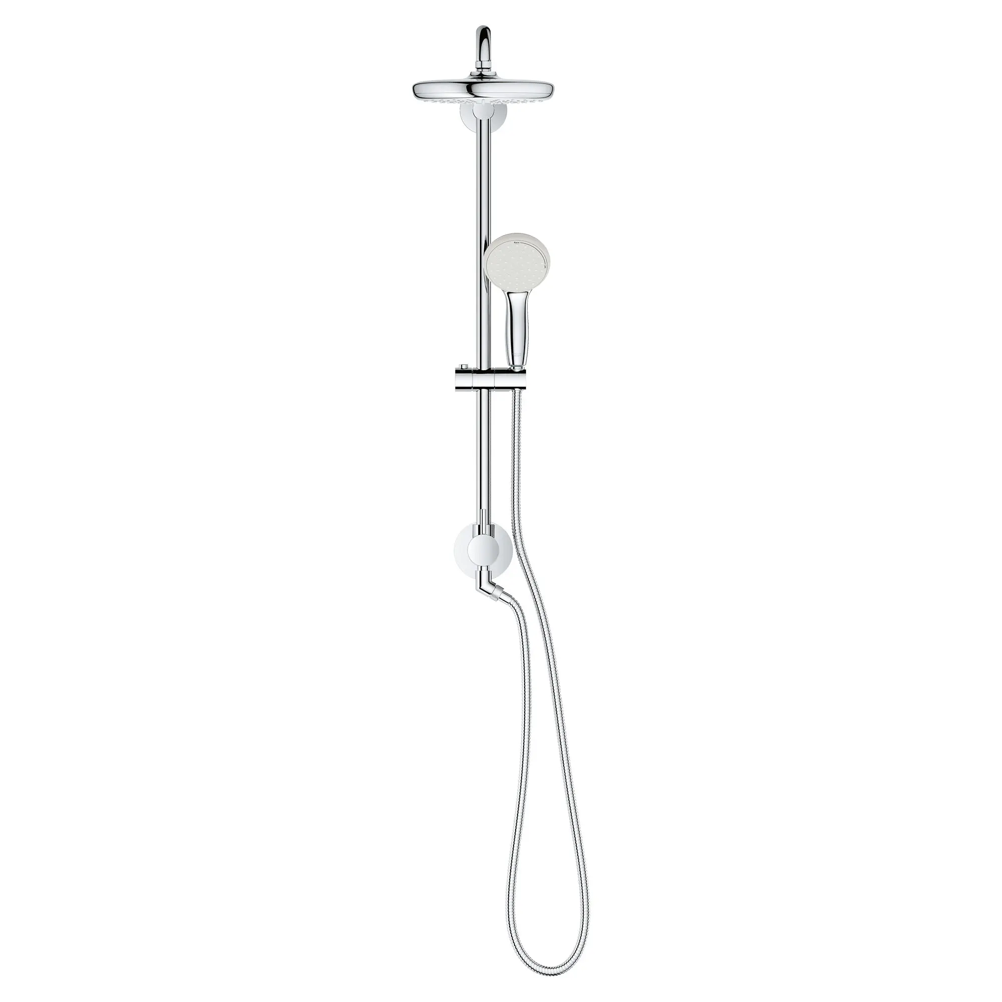 - Distance between diverter and upper bracket 25 3/4" (653 mm),Angle adapter to prevent hose interfering with shower valve,System includes 2 back flow preventers,59" Metal shower hose (26 994),Tempesta 210 shower head, 1.75gpm (26 409),1 Spray: Rain,Tempesta 110 hand shower, 1.75gpm (26 758),3 Adjustable spray patterns: Rain, Jet & Massage,GROHE Retro-Fit shower system (26 485),Optional: Wall spacer for upper bracket (26 030) (sold separately),Optional: Shower system 6" height extension (26 464) (sold separately)