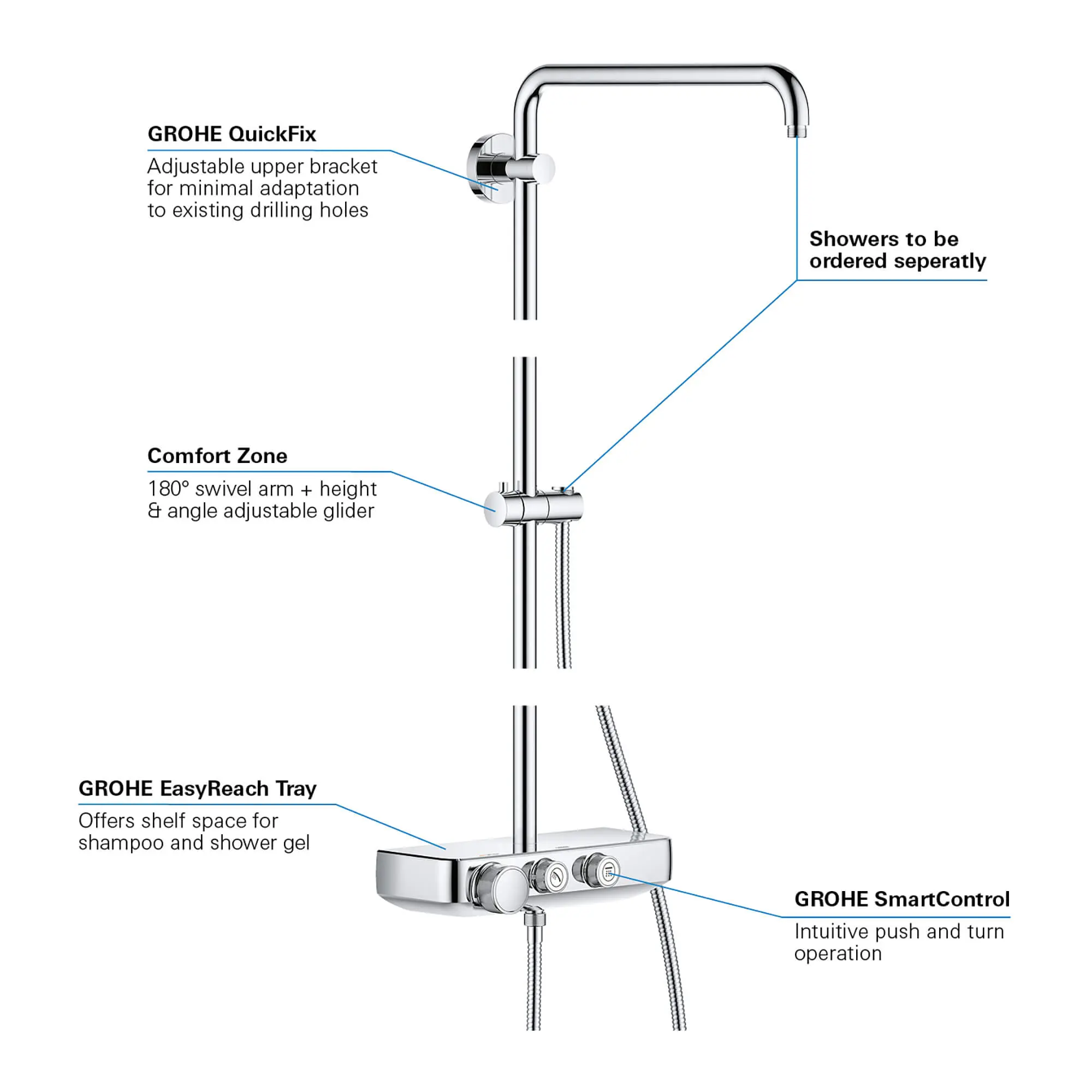 - 69" Rotaflex metal shower hose (26 995),Integrated GROHE EasyReach shower tray,Includes adapters for easy installation (depth adjustable),Showerhead and hand shower are NOT included (sold separately)