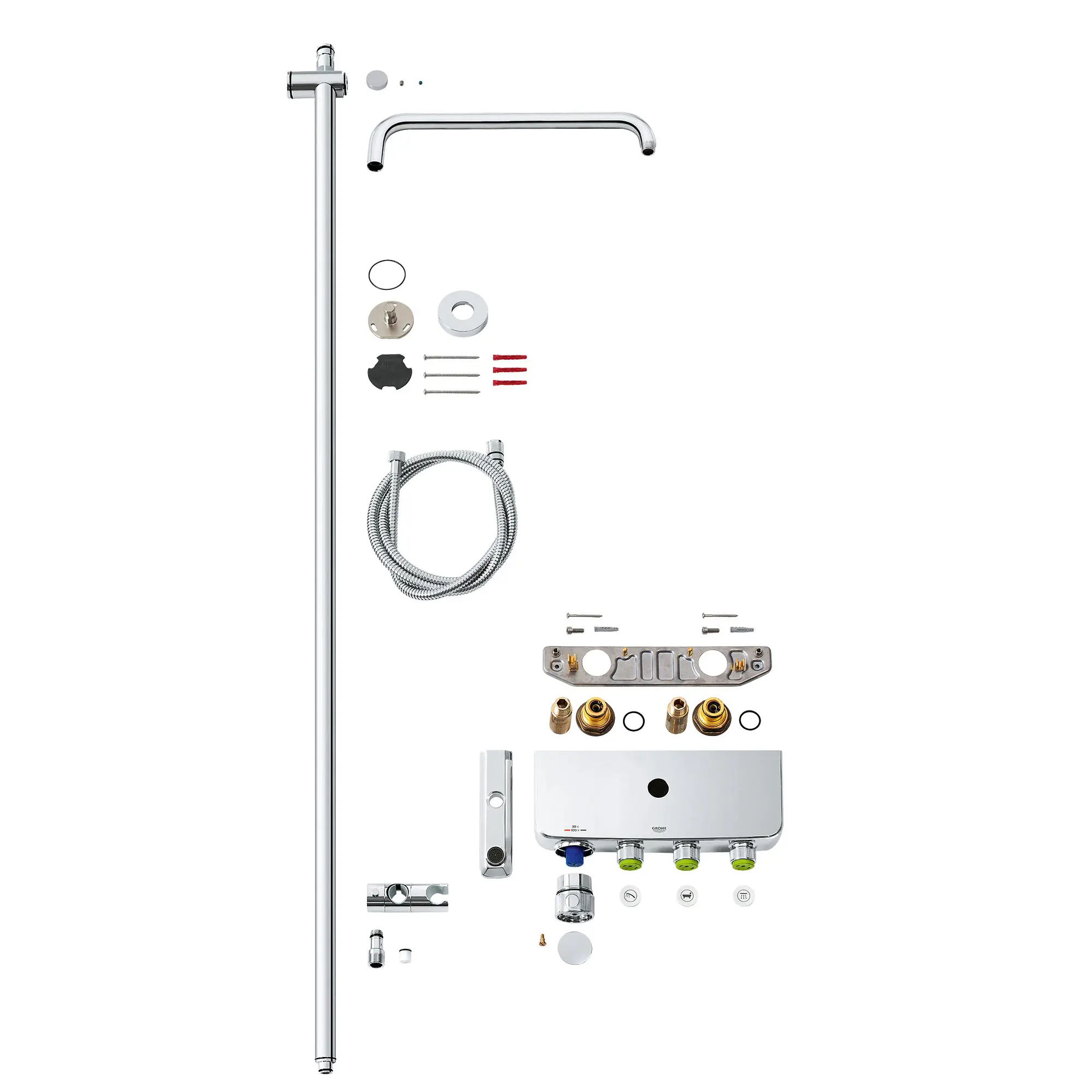 - Adjustable height with hand shower holder,69" Rotaflex metal shower hose (28 025),Integrated GROHE EasyReach shower tray,Includes adapters for easy installation (depth adjustable),Tub spout flow rate: 5.3gpm (20 L/min) at 45psi,Showerhead and hand shower are NOT included (sold separately)