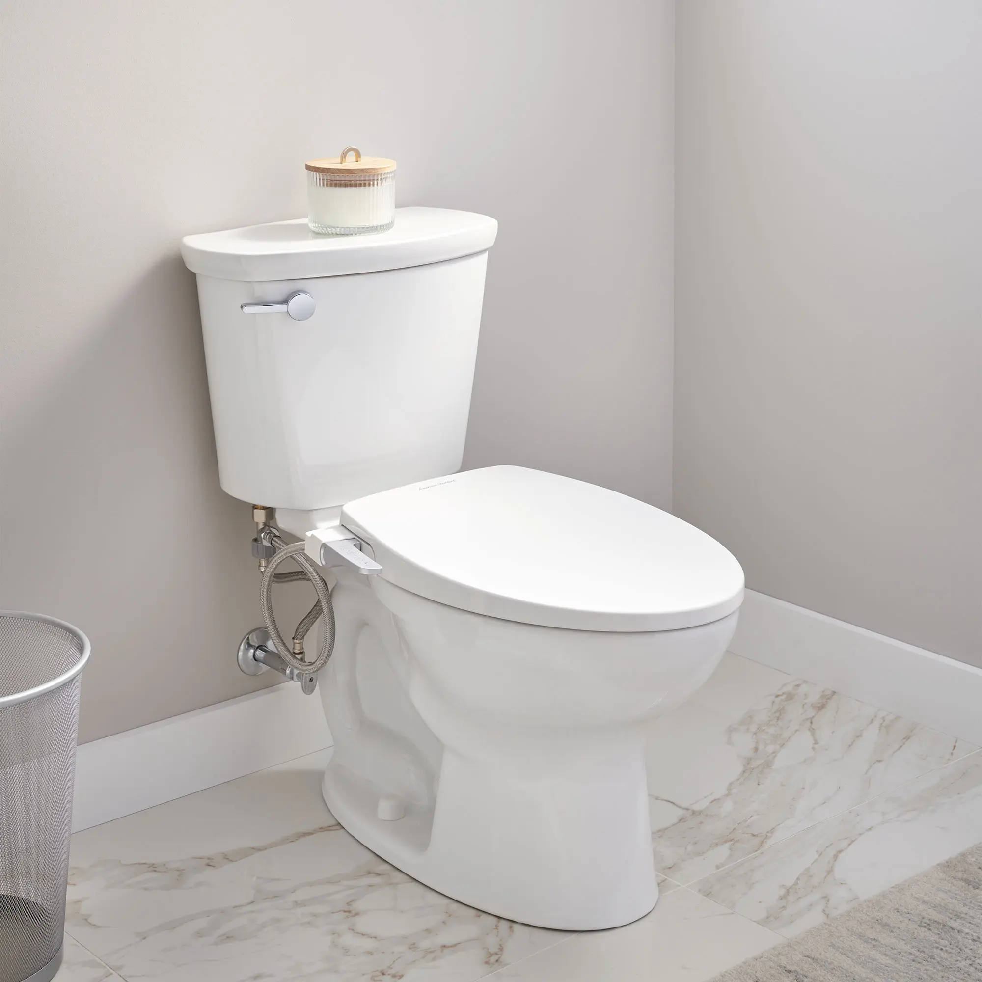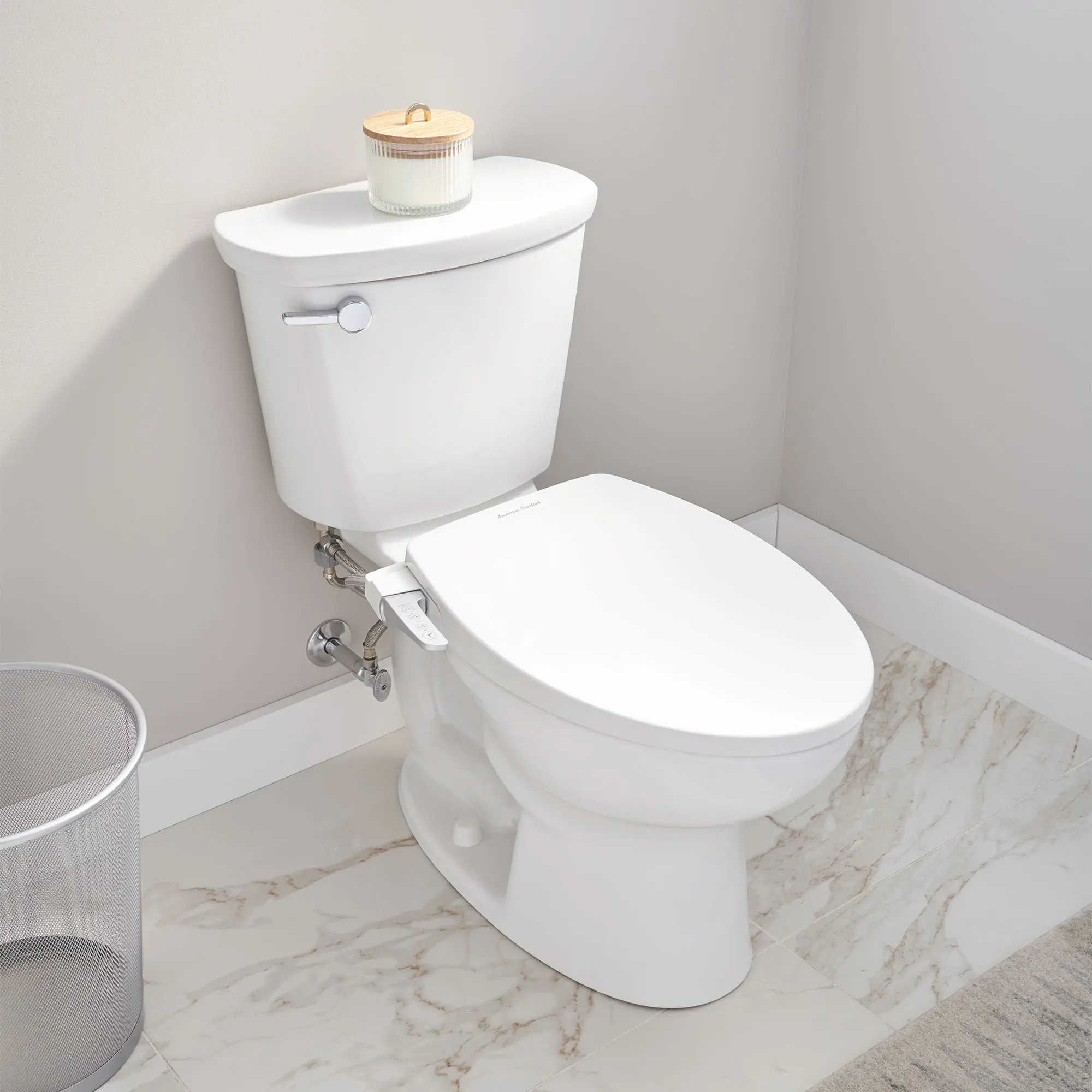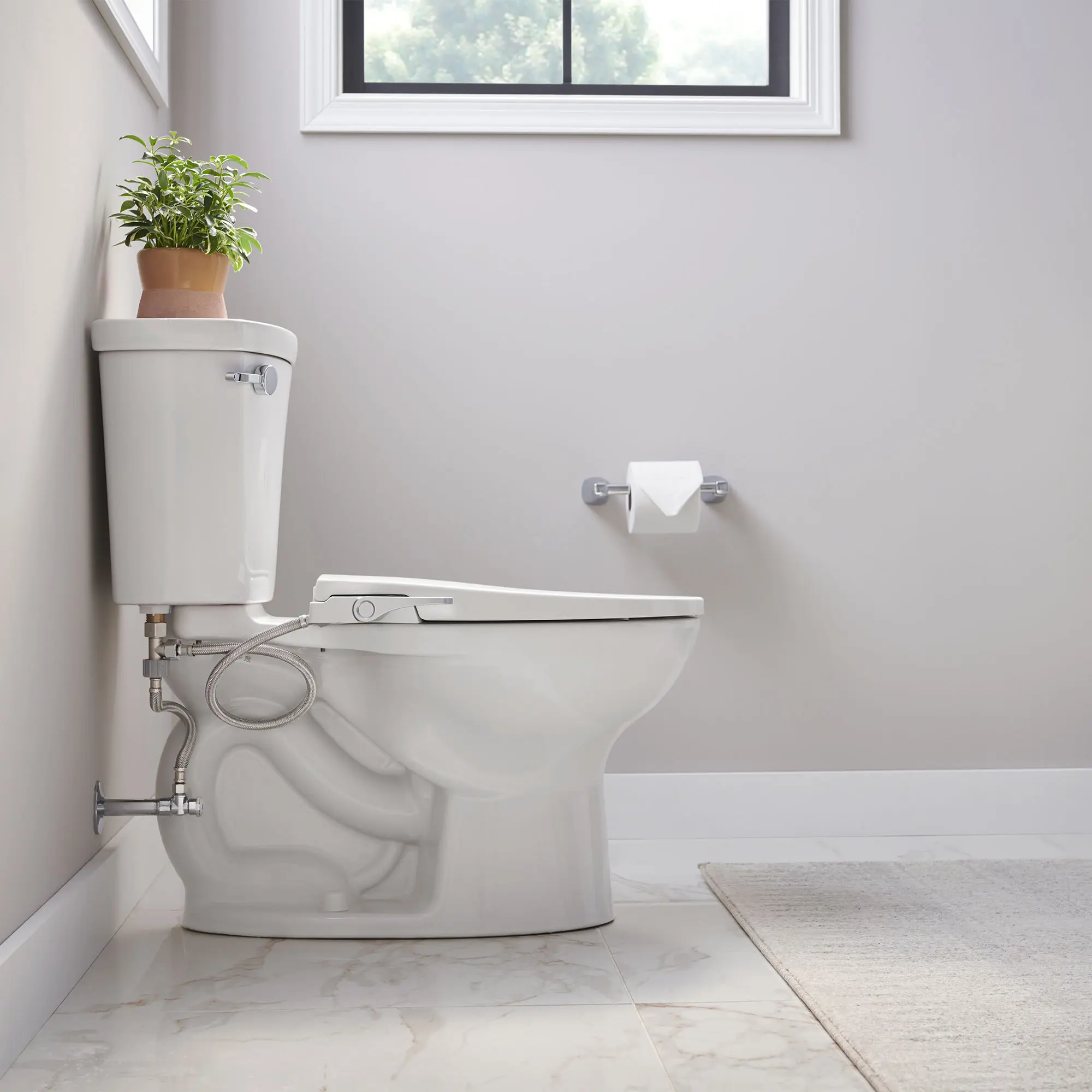 - Ergonomically designed handle offers intuitive operation,Seamless telescoping lid design conceals the seat ring,Includes mounting hardware, water supply hose and seat,Fits most conventional elongated toilets