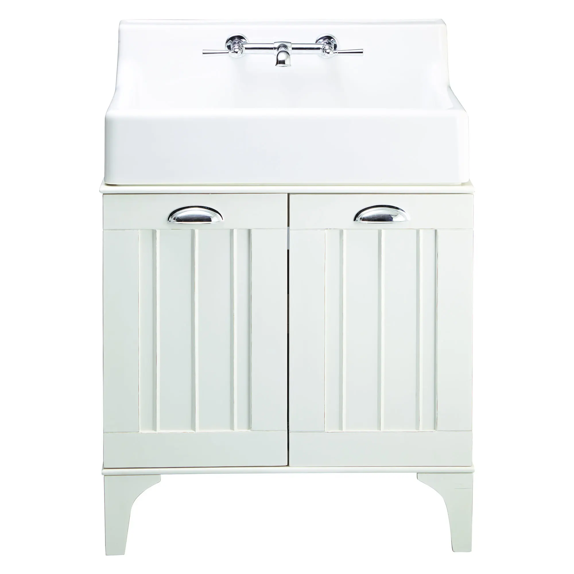 - White oak finish is distressed and includes cast brass handles in Polished chrome with wainscot panel doors